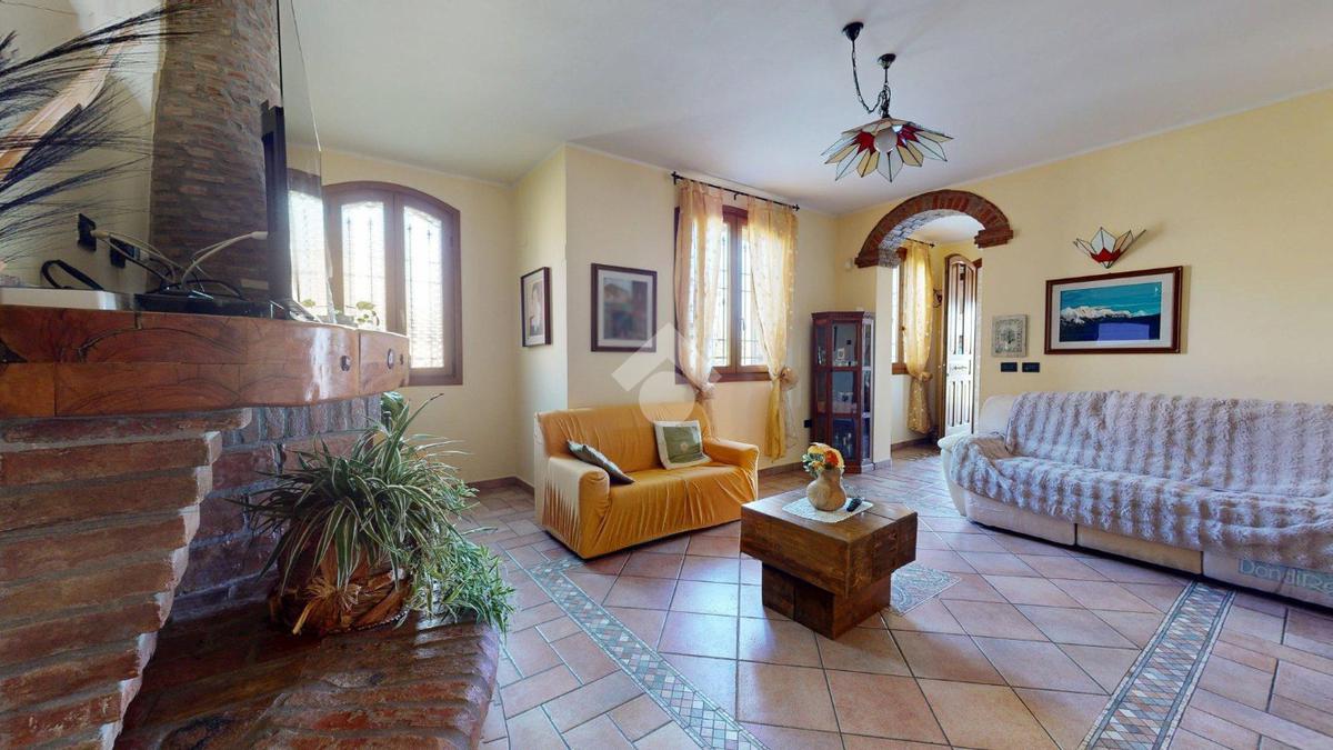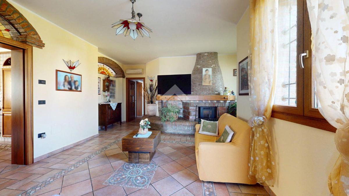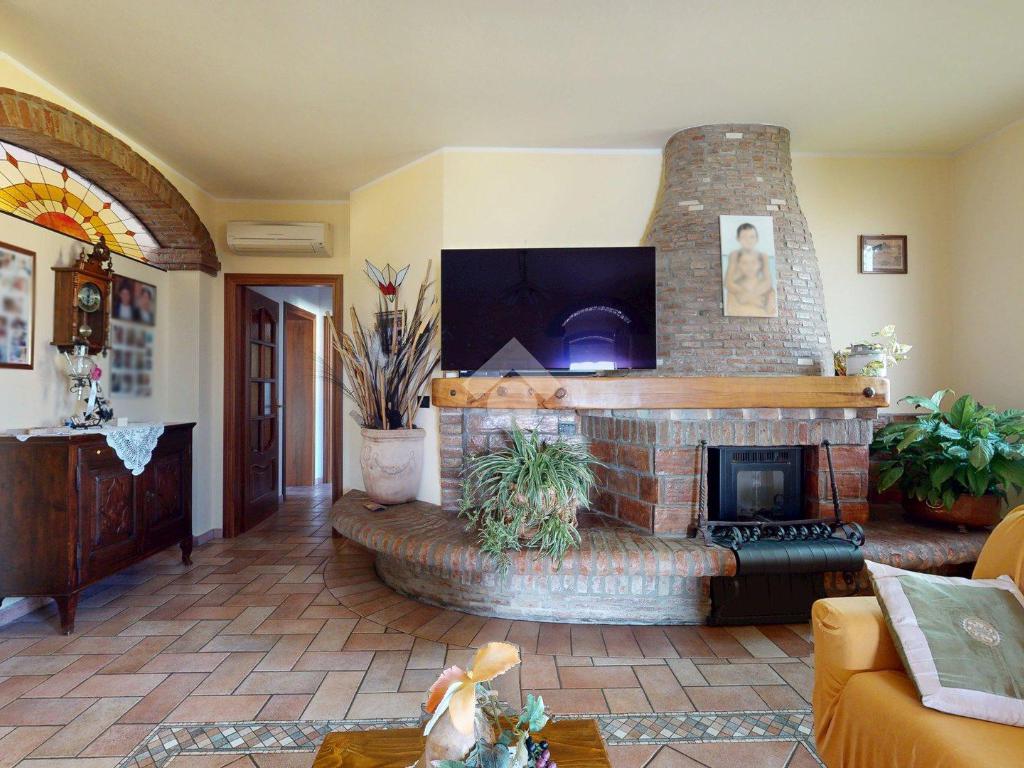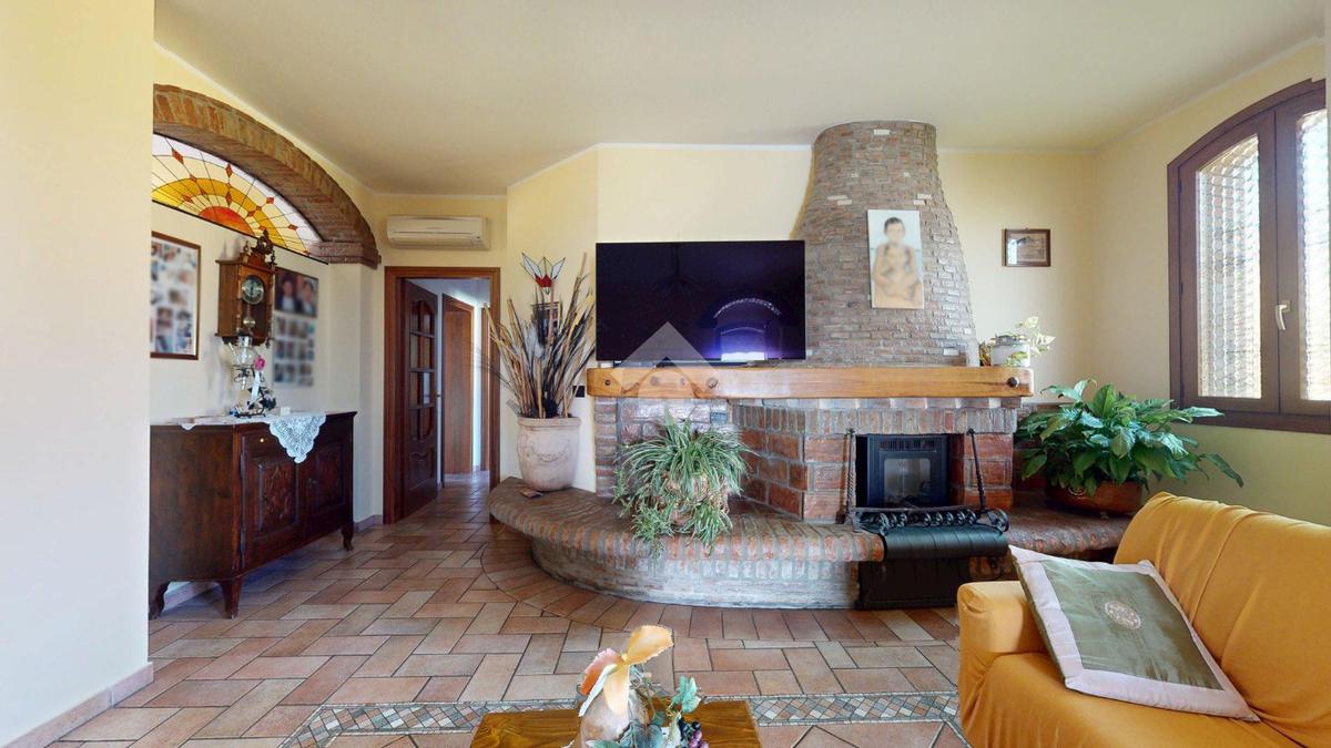 Superata la soglia, si entra in un ampio soggiorno con camino, luminoso e centrale: il cuore della casa.