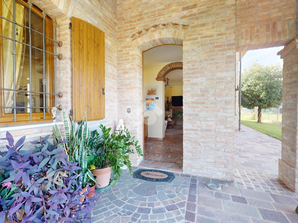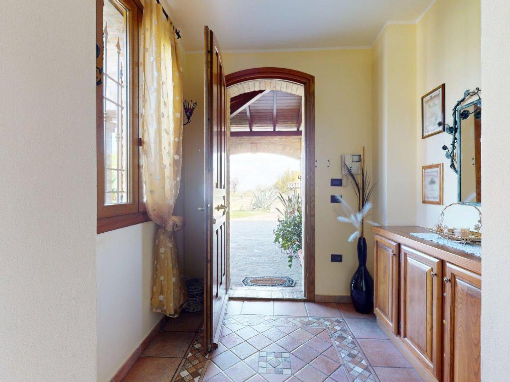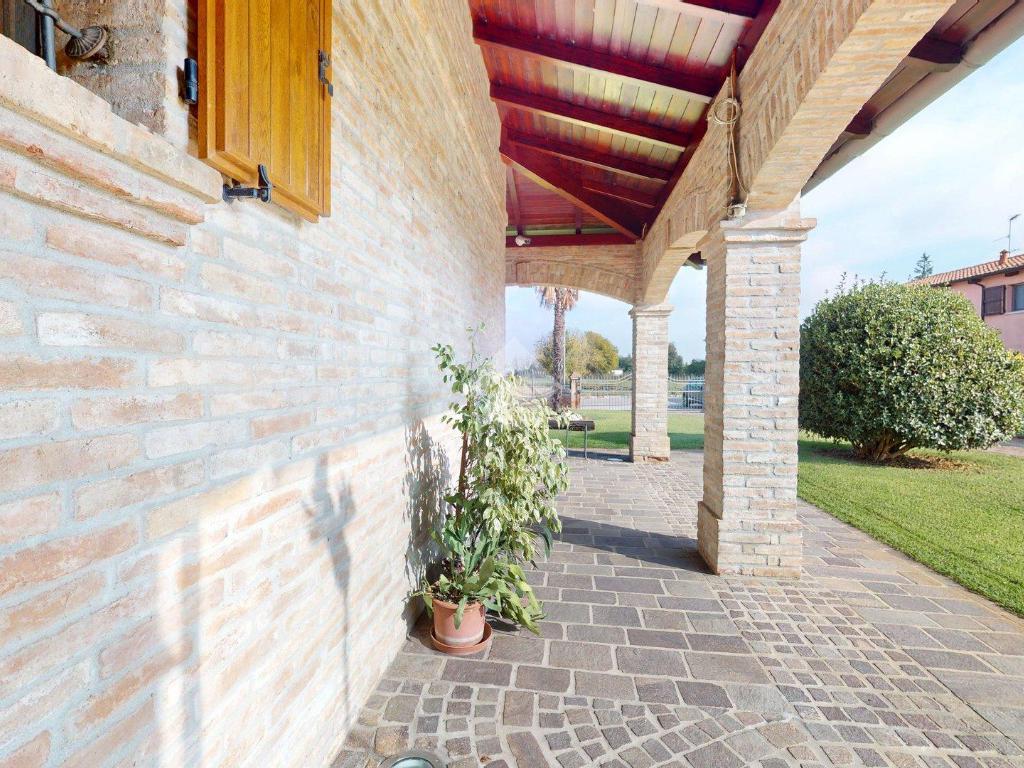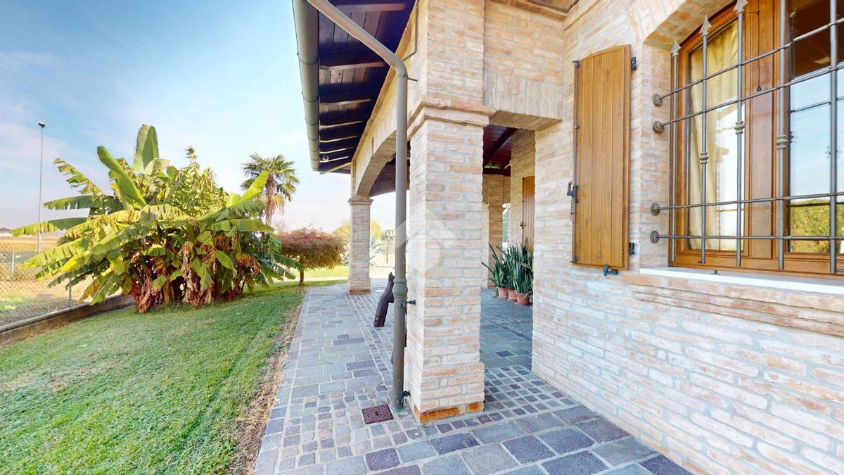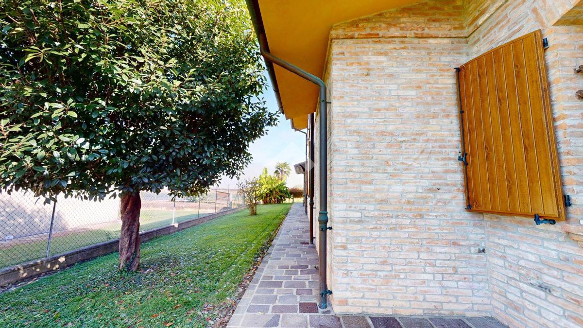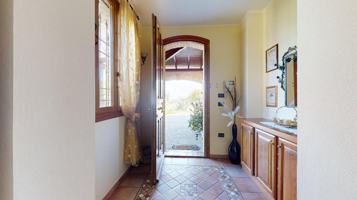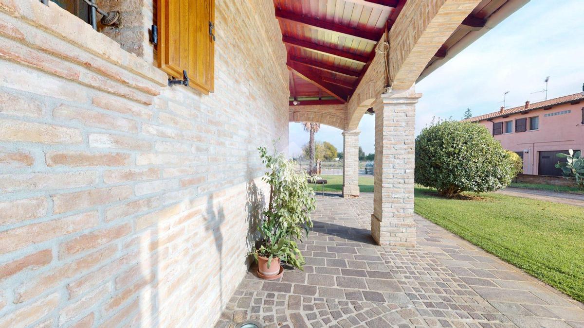 L’ingresso è autonomo, sotto un portico in mattoni a vista, restaurato nel 2025 levigando le travi di legno e trattandole con impregnanti protettivi.