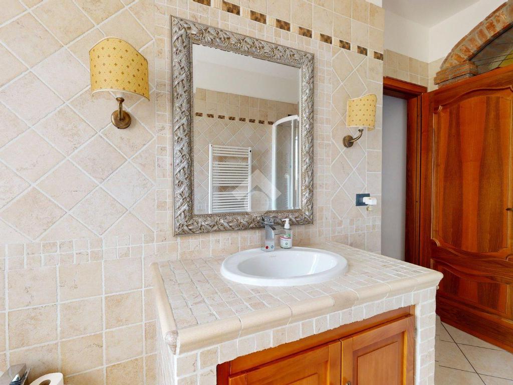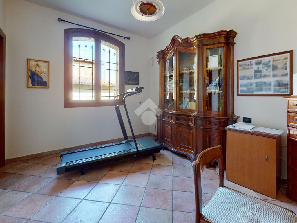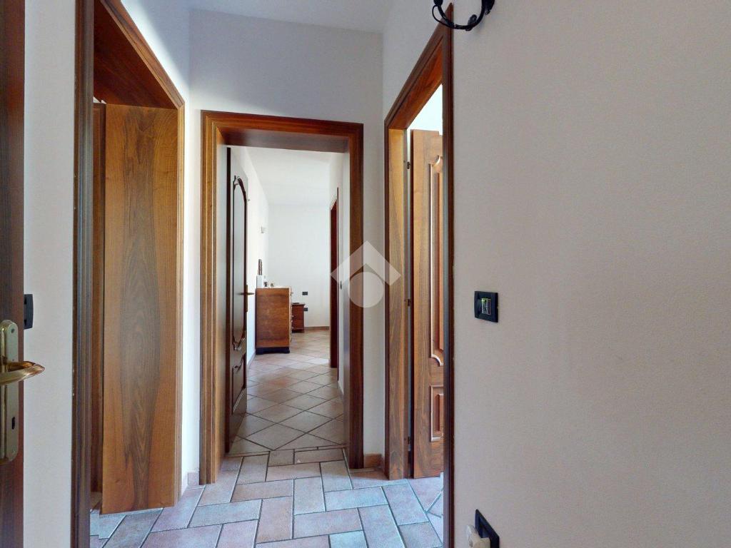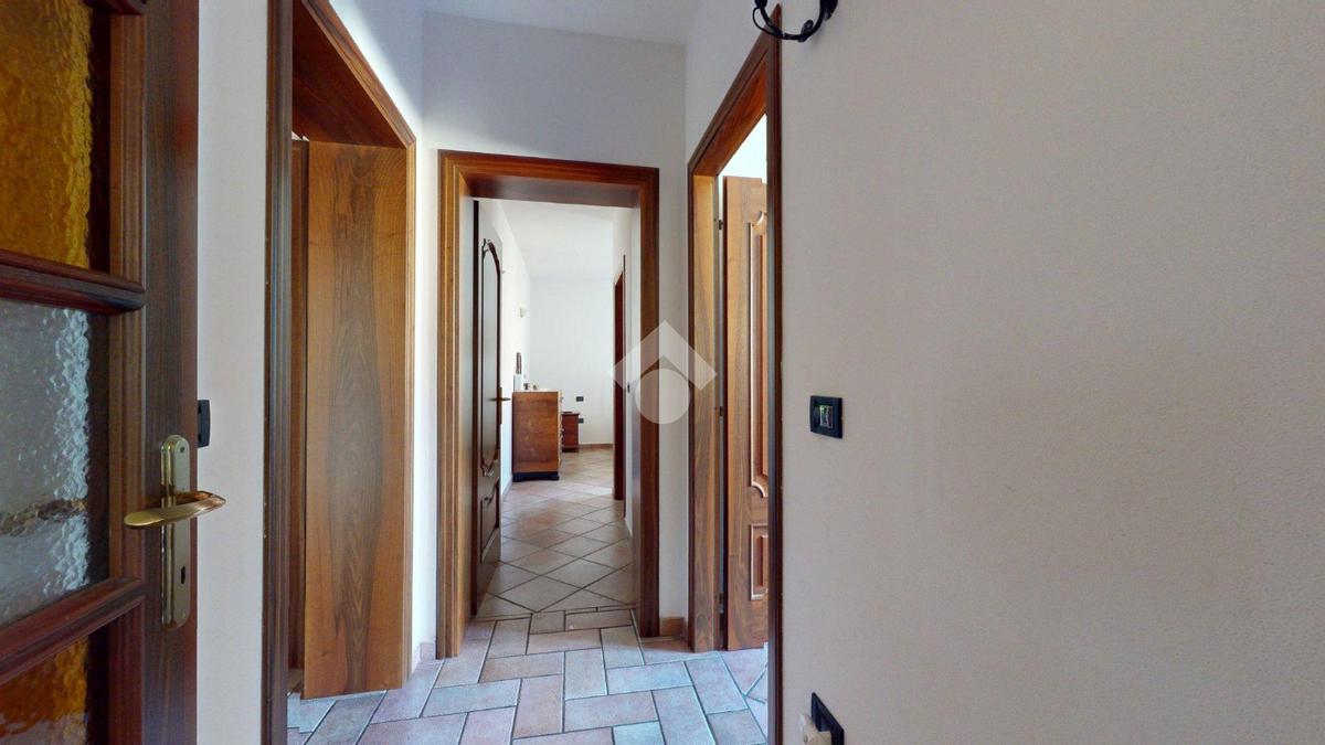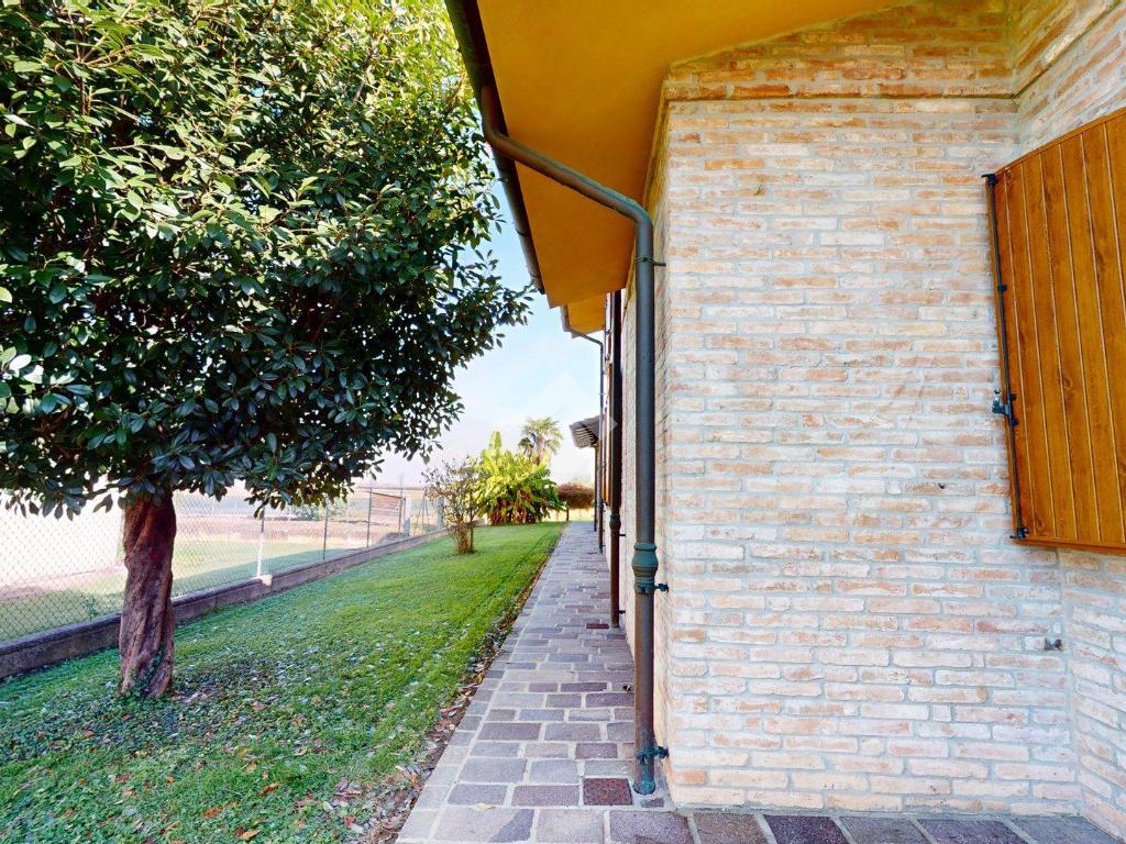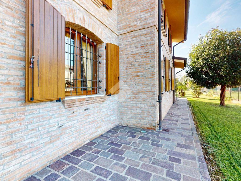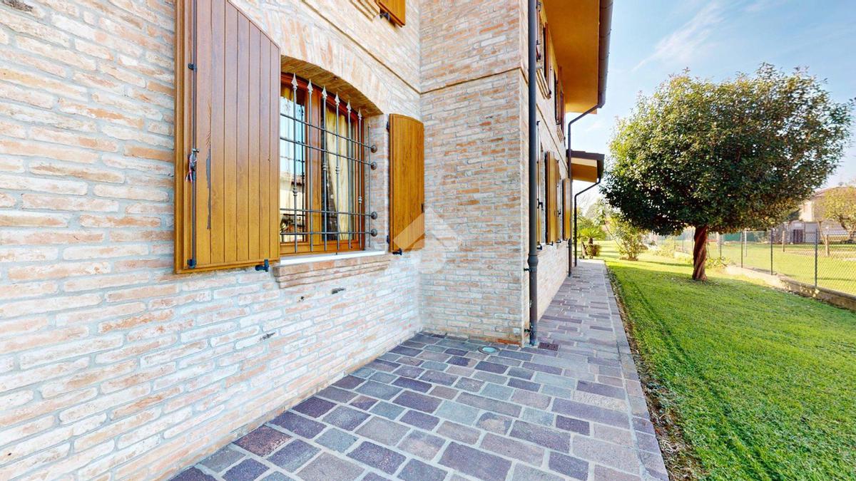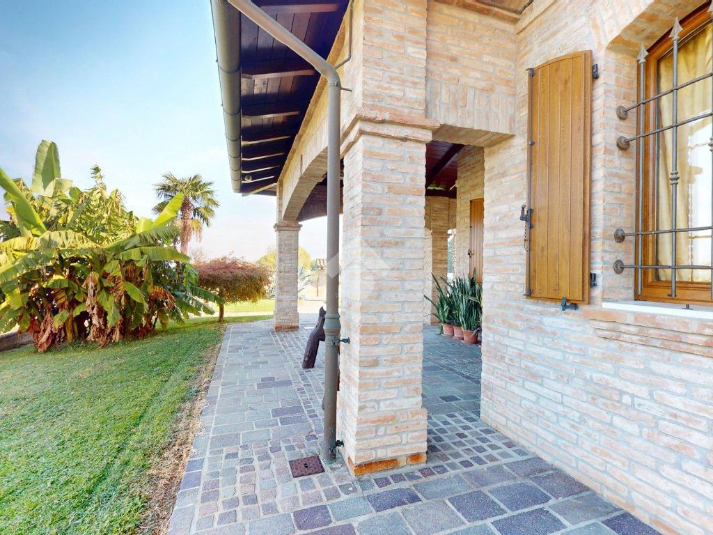L’ingresso è autonomo, sotto un portico in mattoni a vista, restaurato nel 2025 levigando le travi di legno e trattandole con impregnanti protettivi.