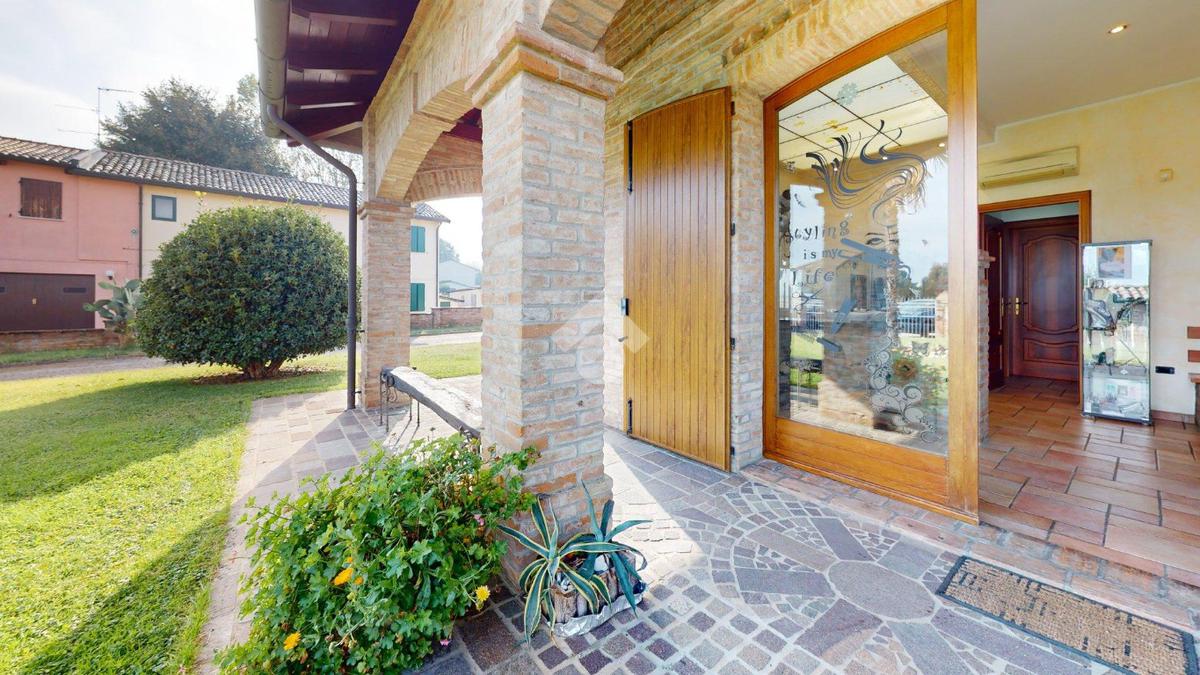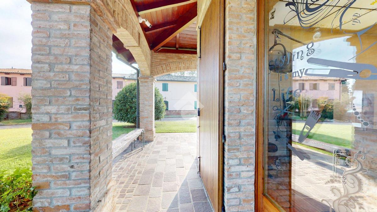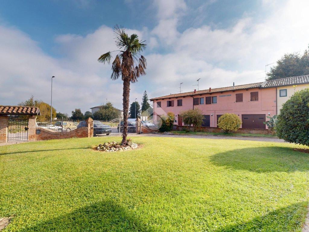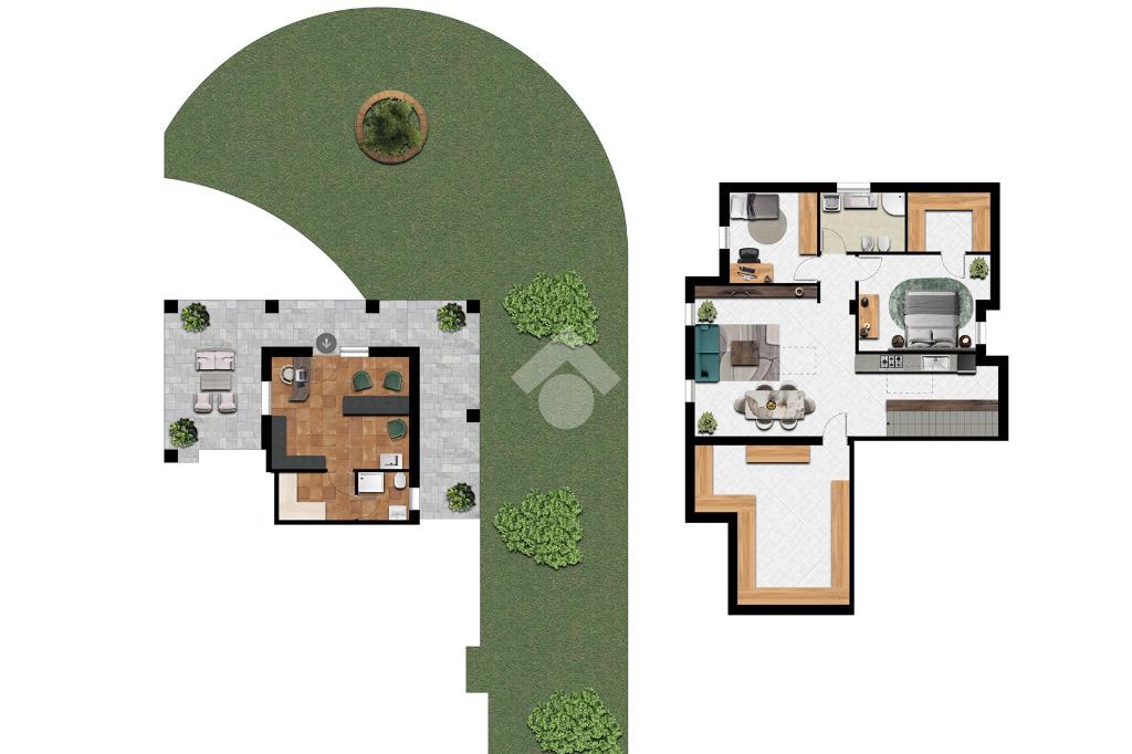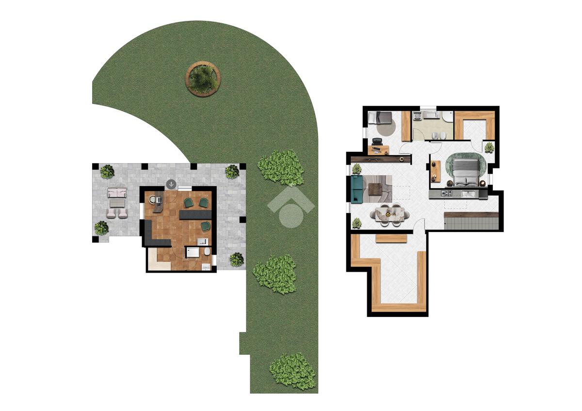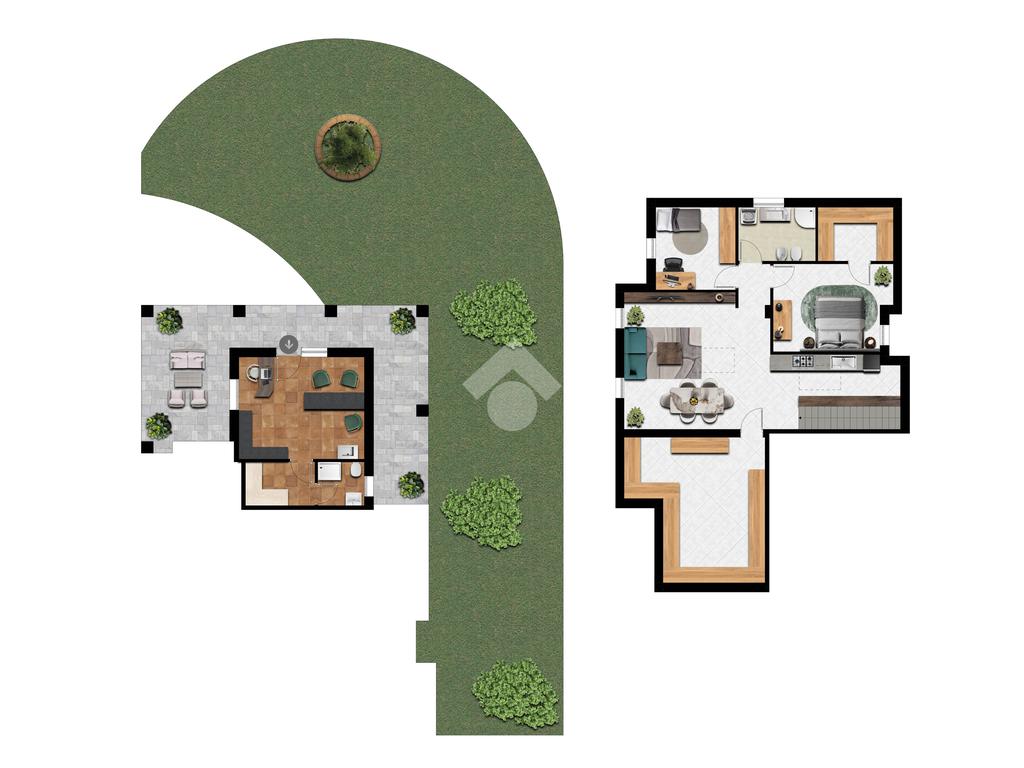 Da lì, il giardino privato di circa 250 mq si estende in avanti, dalla porta della scala fino al portico, seguendo un andamento curvo che accompagna il perimetro e delimita con naturalezza il confine tra le due unità.