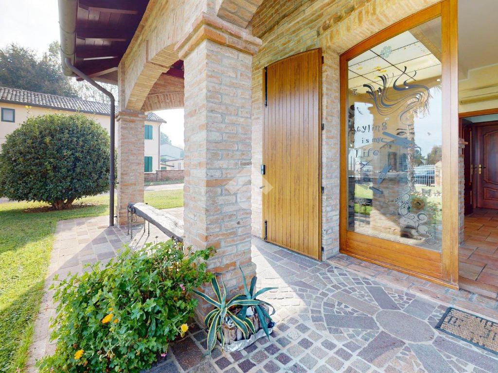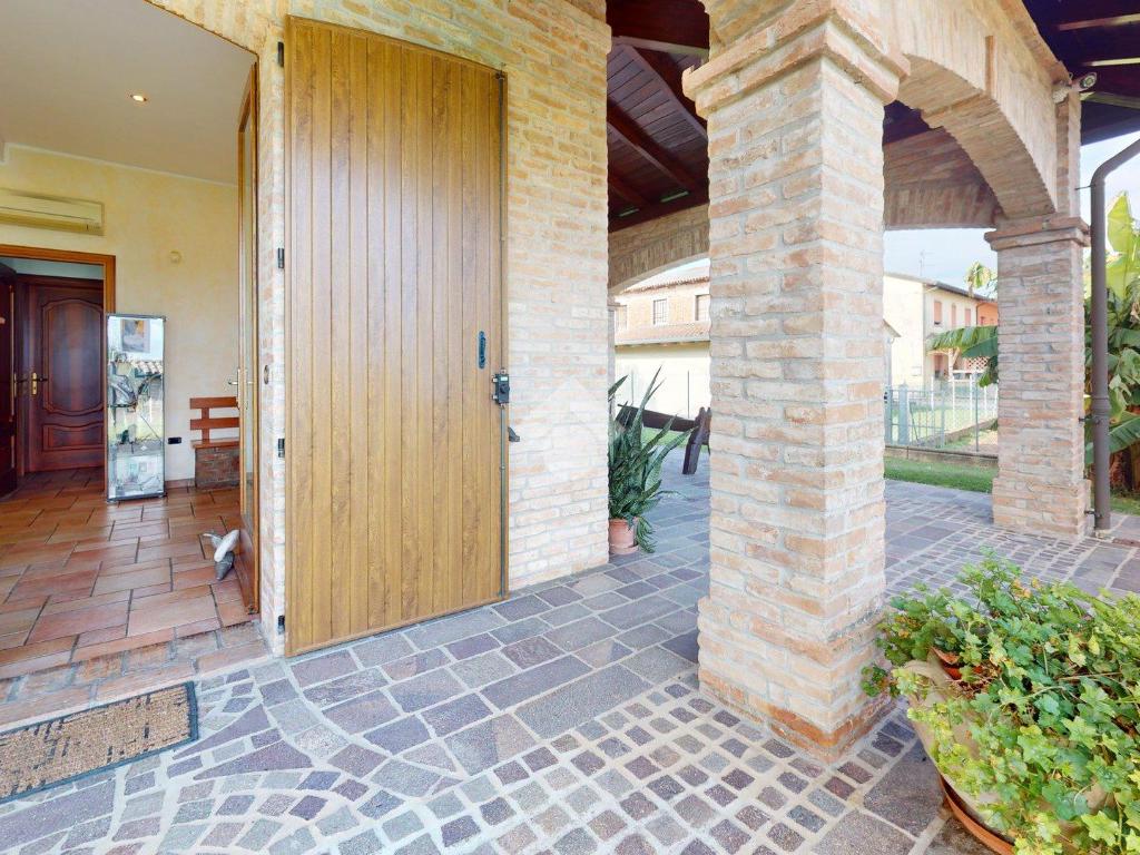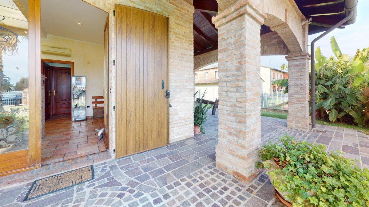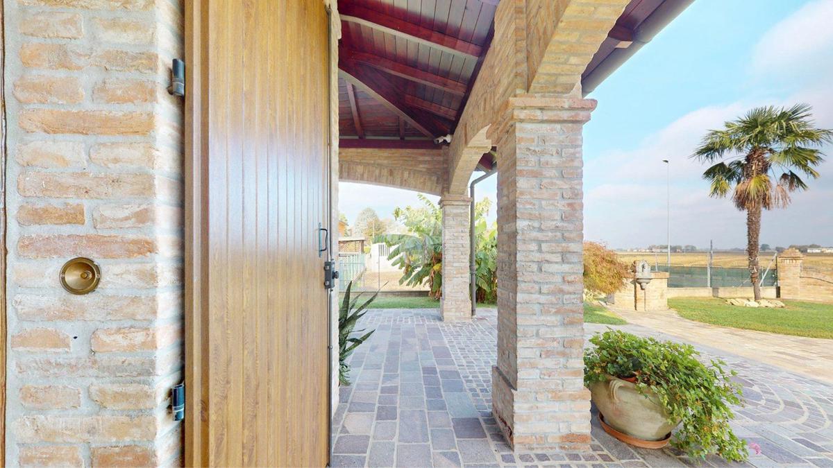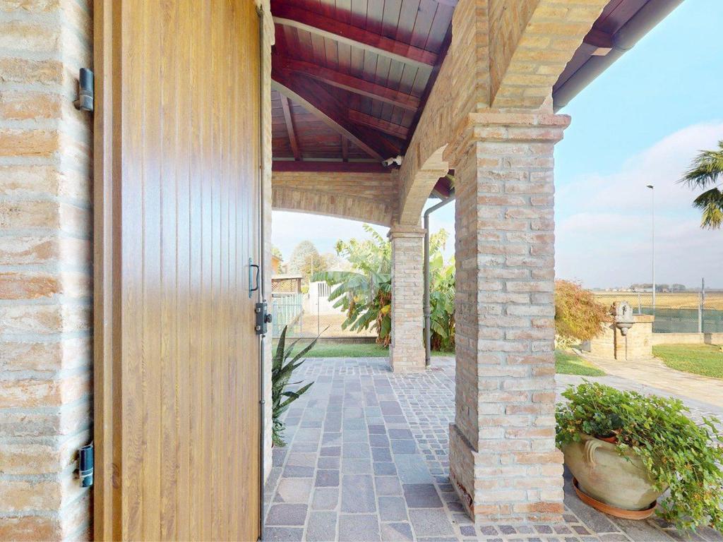 Sul fronte, aderente alla casa, si apre il portico in mattoni a vista, con travi levigate e protette nel 2025 da impregnanti idrorepellenti.